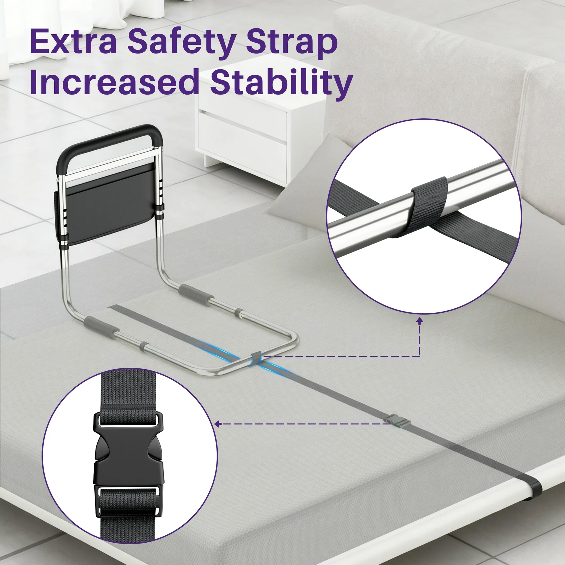 • Enhanced Stability with Larger, Stronger Frame: These Bed side rails deliver uncompromising stability, featuring a wider, longer chassis and thicker tube walls for extra strength. The non-slip foam increases grip between mattress and box spring, while the seat belt strap anchors the rail securely to the opposite side for a firm, wobble-free hold.