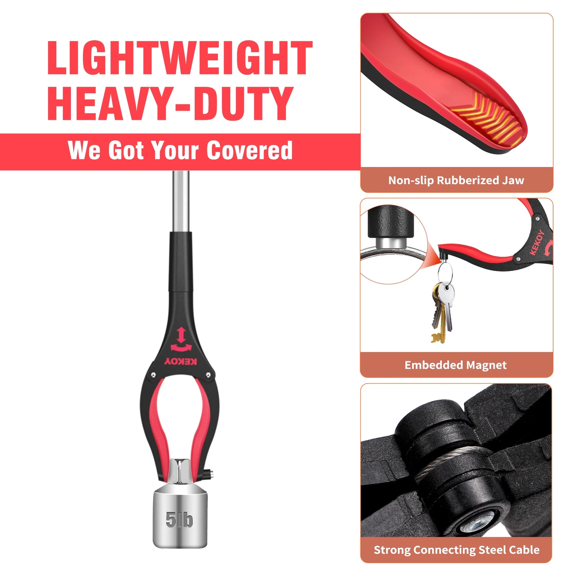 Kekoy 36" grabber reaching tool is perfect for the elderly, those with mobility challenges, or anyone who wants to avoid straining their back. This blue reacher grabber tool is longer than most of other 32" pick up tool . With Kekoy's you can reach higher and grab easier. This long-reach grabber can withstand vertical loads of up to 5 lbs and horizontal loads of up to 2lbs. 360°Rotating Jaw makes this picker upper grabber has a more flexible grip angle.This reachers and grabbers for seniors features 1 magnets for picking up small metallic items and is compact and foldable for easy storage, folding down to just 12 inches. 1 pack and 2 pack for choice.