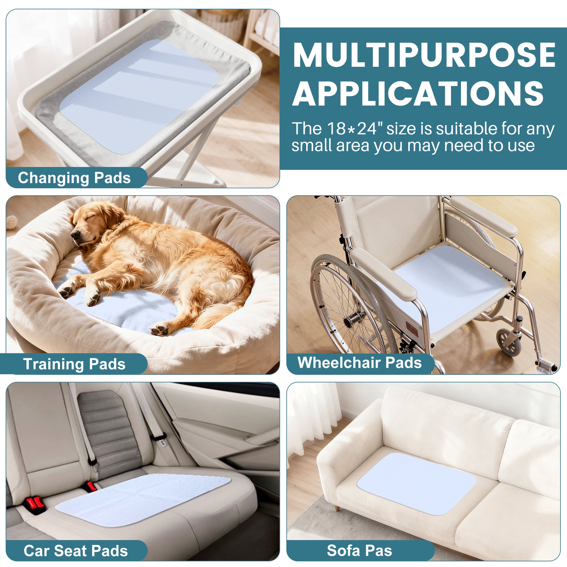 - 【Wide Range of Applications】: The 18x24" size of urine pads is easy to carry and store. It is suitable for chairs, car seats, power wheelchairs, sofas, pet beds, and small areas where incontinence protection is required.