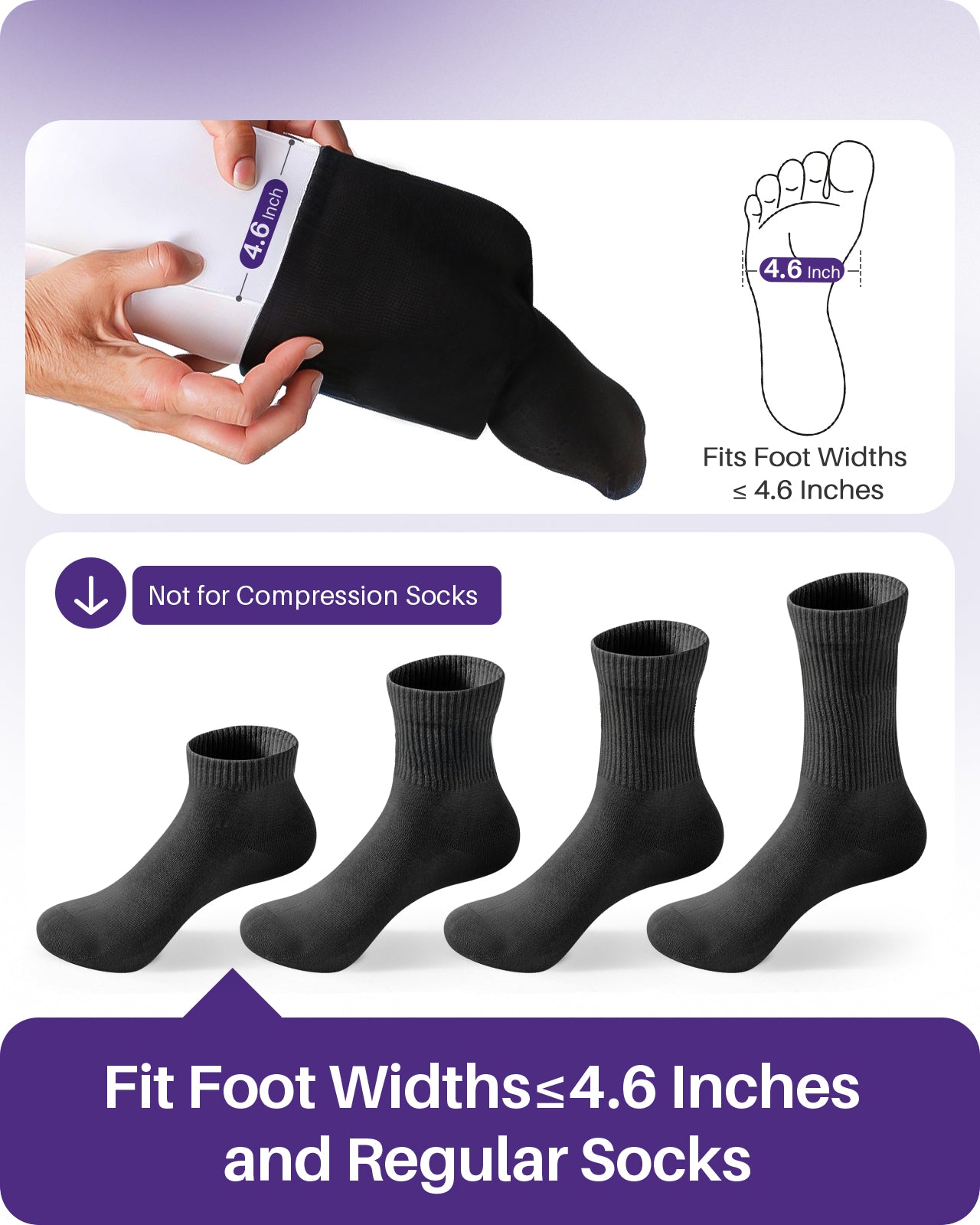 - 【4.6inch Extra Wide Design】:The sock aid is suitable for foot widths measuring 4.6 inch/11.68cm or less.It is not for use with compression socks or compression stockings. Recommended regular sock types: ankle socks, flat socks, knee socks, calf socks, sports socks, dress socks, etc.