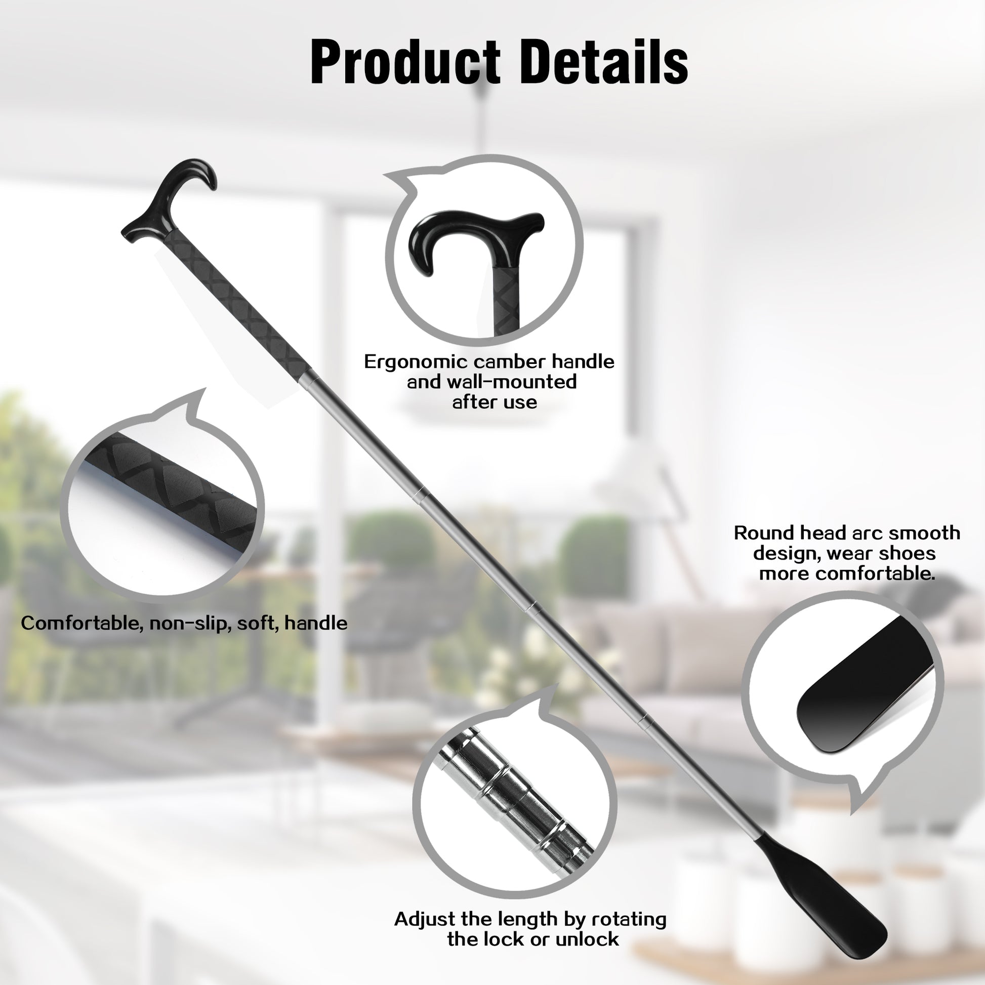 - Telescopic Shoehorn——The stainless steel material is solid and not easy to break, and the length can be adjusted flexibly. The Long Handled Shoe Horn have four lengths to choose.You can put on your shoes/ boots sitting or standing without bending over. The extra long shoe horn is a must-have kit for those with limited mobility such as pregnancy, arthritis, hip replacement,etc