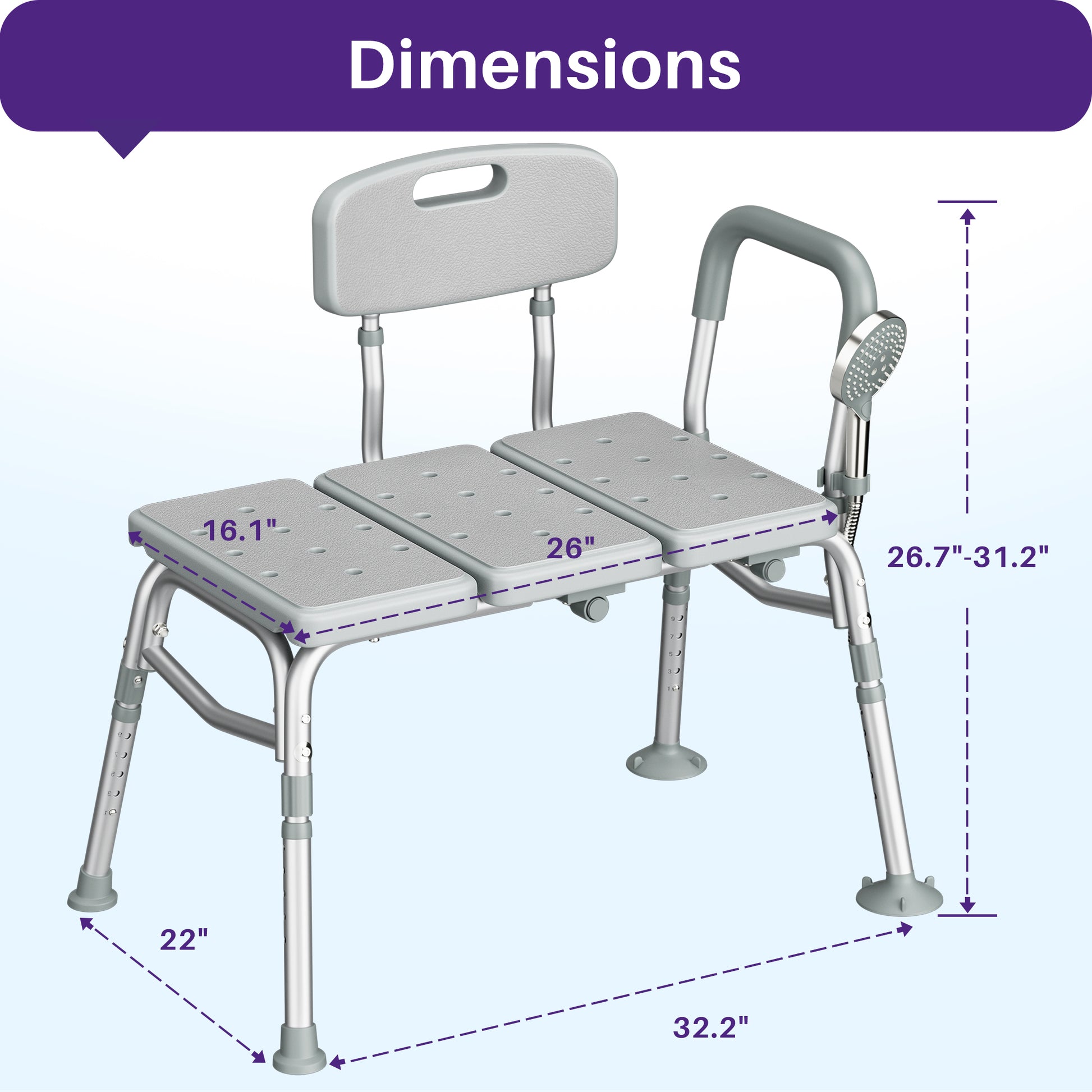 Adjustable Height for Perfect Fit: Customize the proper height with ease! Our shower seats for adults offer 5-level different seat heights, ranging from 17.7" to 22.4" (1 inch per level). Just adjust the spring-loaded push-buttons on each leg,and you're set. Perfect for different bathtub and users heights.