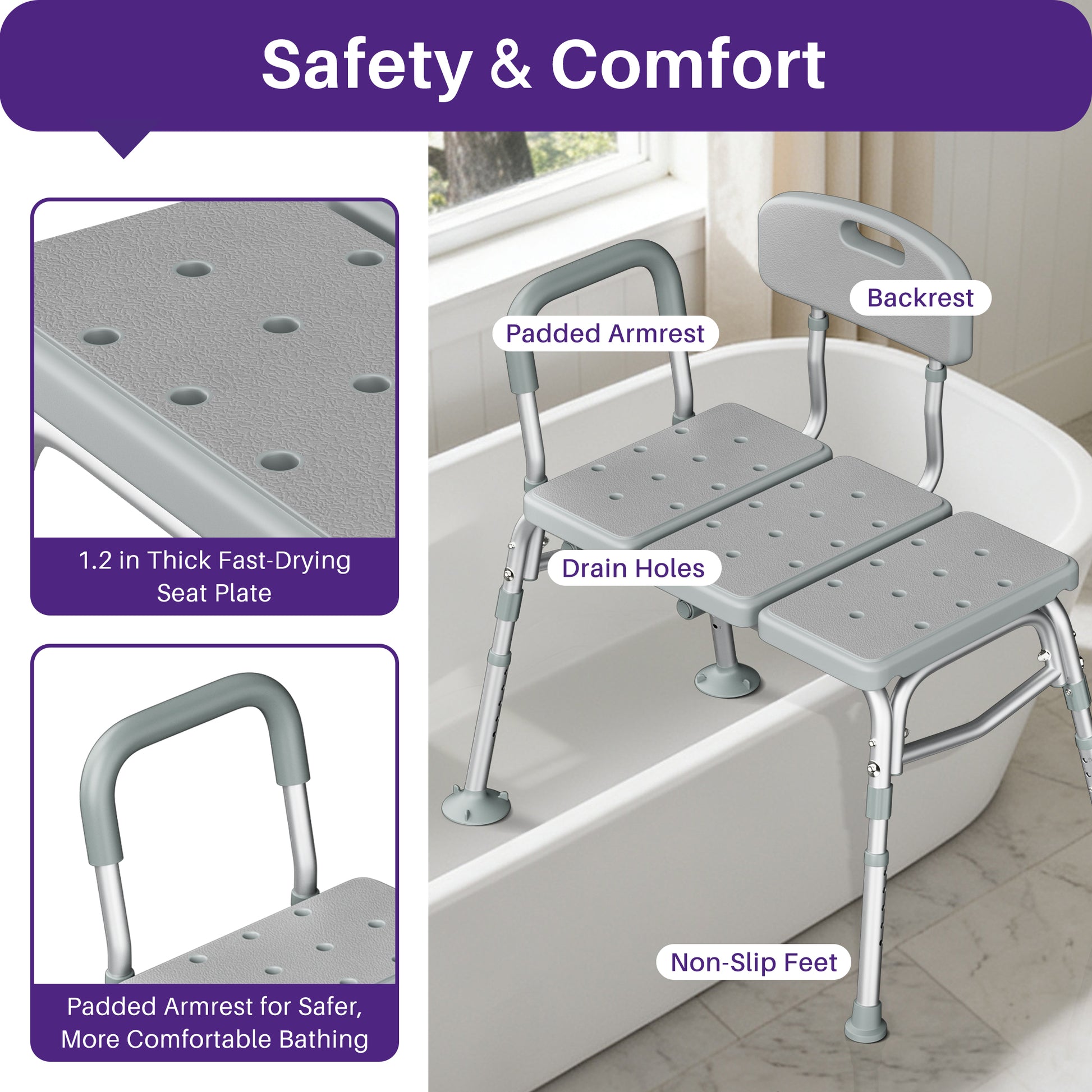 User-Friendly Design: Our shower bench for elderly and disabled features a reversible backrest that can be installed on either side, facilitating easy entry and exit from the bath.Assembly is quick and tool-free—simply unpack, set it up, and enjoy a safer bath experience!