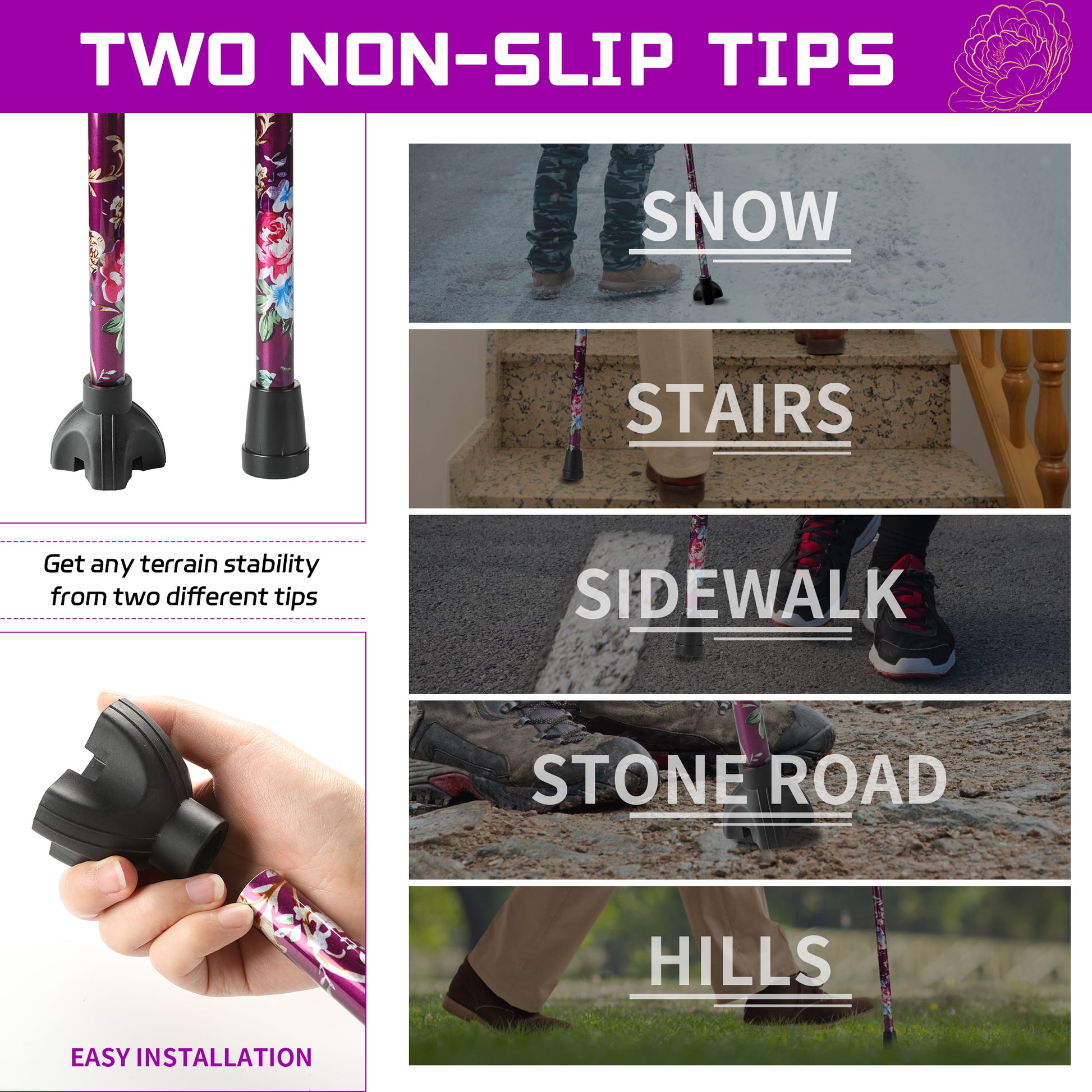 - 【Two Replaceable Cane Tips】:An extra wide base helps the crutches stand on their own. Another common base is easy to carry. The anti-slip design provides a good strong grip, giving the cane excellent anti-slip properties and wear resistance to walk on any surface