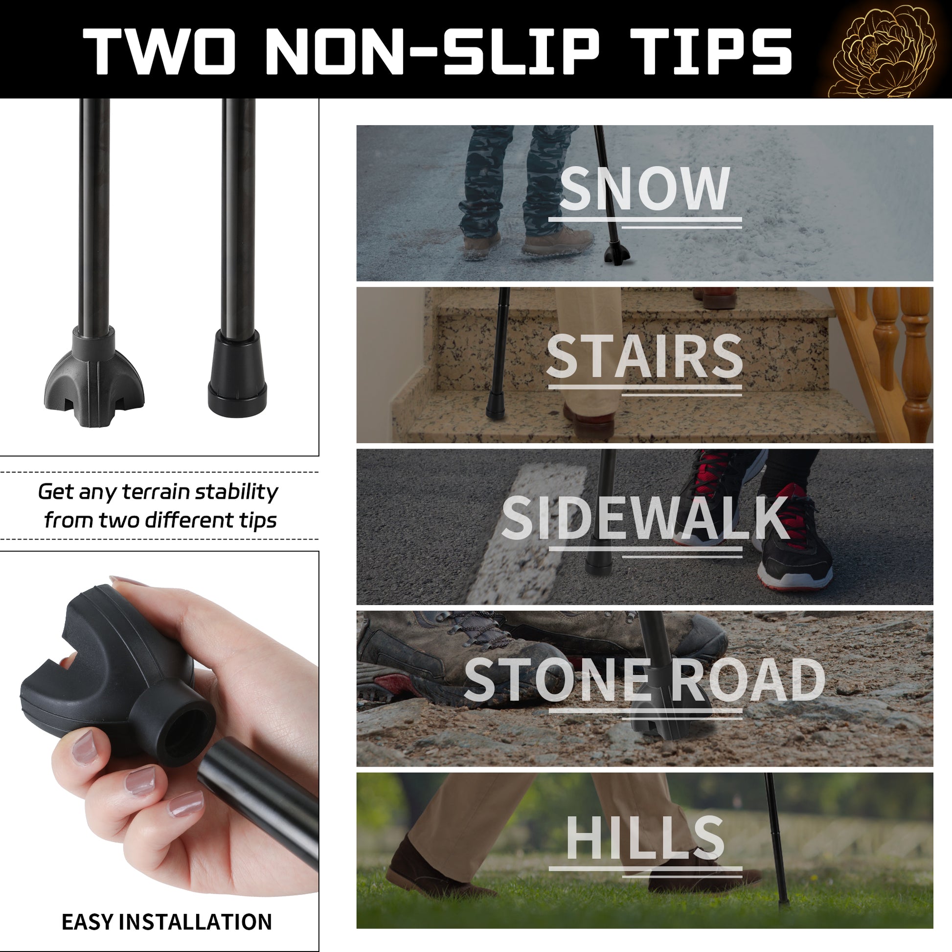 - Replaceable Cane Tips - An extra wide base helps the crutches stand on their own. Another common base is easy to carry. The anti-slip design provides a good strong grip, giving the cane excellent anti-slip properties and wear resistance to walk on any surface